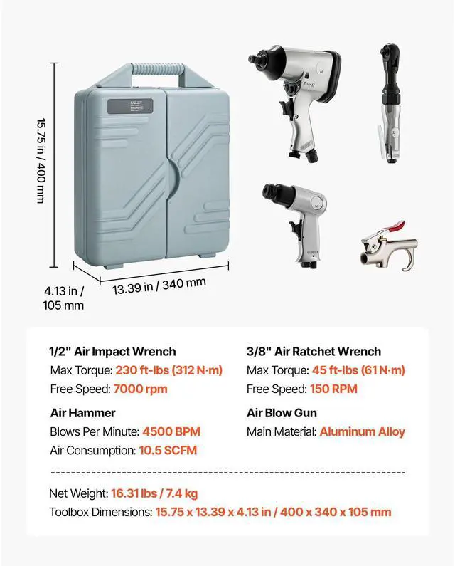 1/2" Air Impact Wrench: 230 ft-lbs; 7000 rpm,Toolbox Dimensions: 15.75 x 13.39 x 4.13 in / 400 x 340 x 105 mm,Air Hammer: 4500 BPM,3/8" Air Ratchet Wrench: 45 ft-lbs ; 150 RPM,Item Model Numbber: WF-009,Net Weight: 16.31 lbs / 7.4 kg