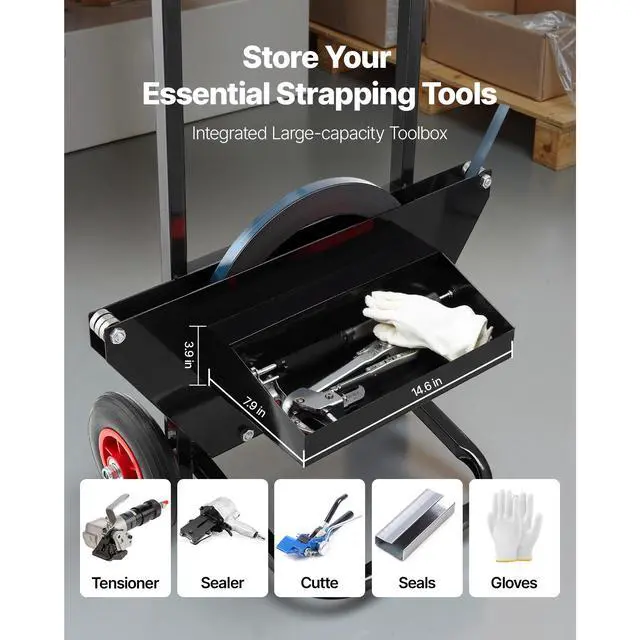 Suitable Coil Outer Diameter: 23.6 in / 600 mm,Toolbox Dimensions: 14.6 x 7.9 x 3.9 in / 37 x 20 x 10 cm,Item Model Number: GD500,Product Weight: 28.4 lbs / 12.9 kg,Max Load Capacity: 110.2 lbs / 50 kg,Material: Q235 Carbon Steel,Product Dimensions: 17.3 x 26.4 x 39.4 in / 440 x 670 x 1000 mm,Strap Type Compatibility: Steel Strapping Coils
