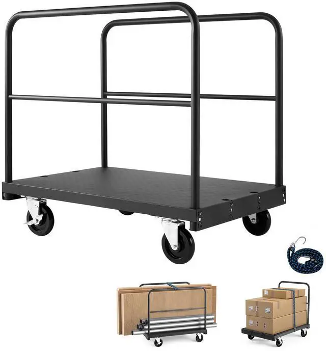 VEVOR Drywall Cart Dolly, 1800 lbs Load Capacity, 2-in-1 Steel Panel Truck Cart with 5 inch Swivel Casters, 36 x 24 inch Platform Truck with 3 Side Handrails for Factory, Warehouse, Garage, Black