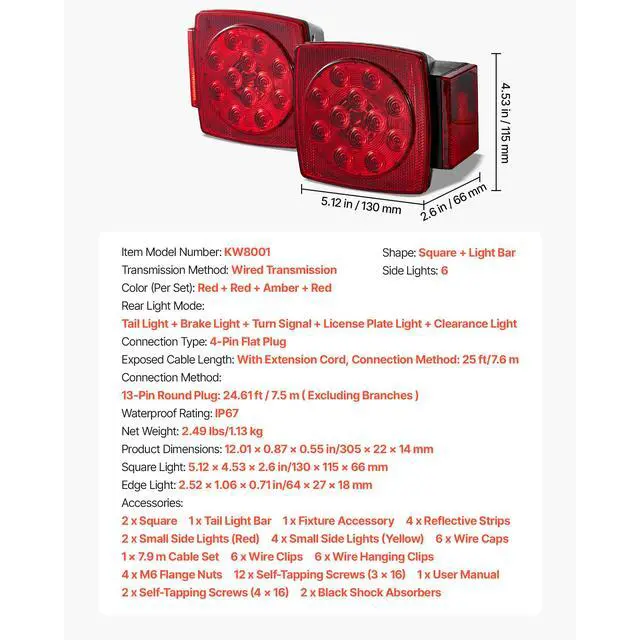 Transmission Method: Wired Transmission,Rear Light Mode: Tail / Brake / Turn Signal / License Plate / Clearance Light,Waterproof Rating: IP67,Square Light Dimensions: 5.12 x 4.53 x 2.6 in/130 x 115 x 66 mm,Item Model Number: KW8001,Product Dimensions: 12.01 x 0.87 x 0.55 in/305 x 22 x 14 mm,Net Weight: 2.49 lbs/1.13 kg,Edge Light Dimensions: 2.52 x 1.06 x 0.71 in/64 x 27 x 18 mm