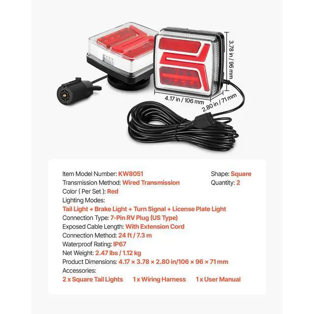 Transmission Method: Wired Transmission,Lighting Modes: Tail Light / Brake Light / Turn Signal / License Plate Light,Waterproof Rating: IP67,Item Model Number: KW8051,Product Dimensions: 4.17 x 3.78 x 2.80 in/106 x 96 x 71 mm,Net Weight: 2.47 lbs/1.12 kg