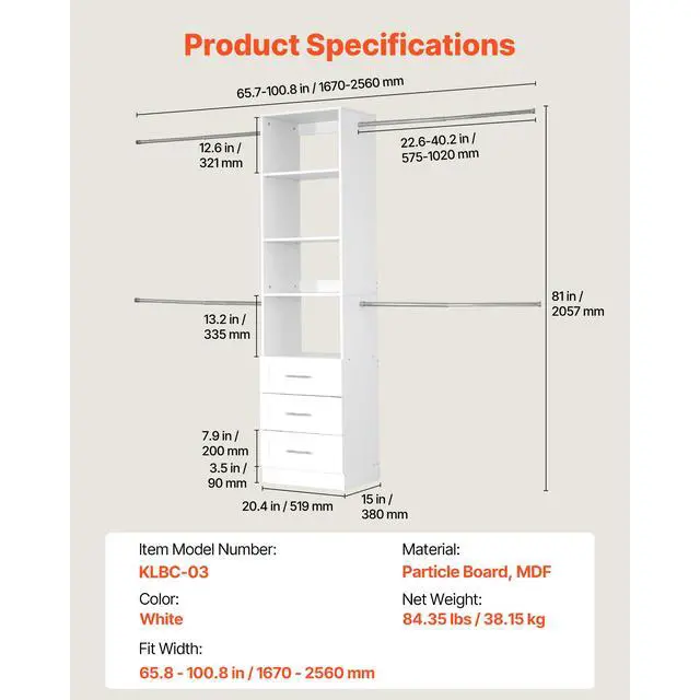 Color: White,Item Model Number: KLBC-03,Material: Particle Board, MDF,Product Dimensions: 65.8 - 100.8 x 15 x 81 in / 1670-2560 x 379 x 2057 mm,Net Weight: 84.11 lbs / 38.2 kg,Fit Width: 65.8 100.8 in / 1670 2560 mm
