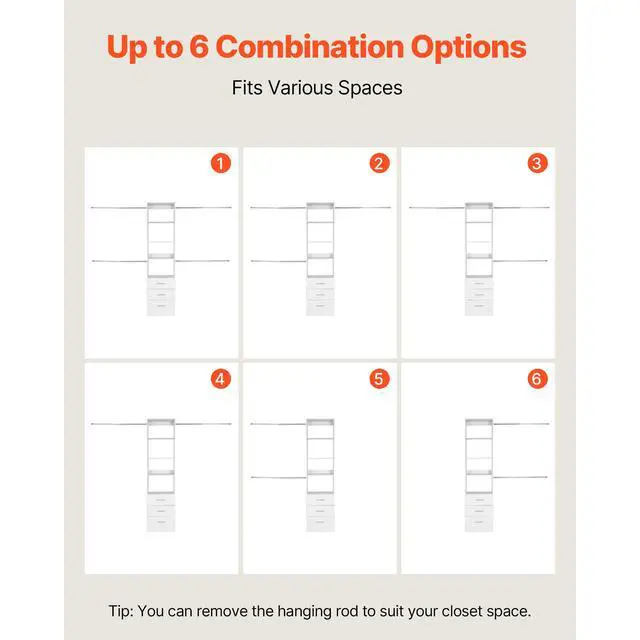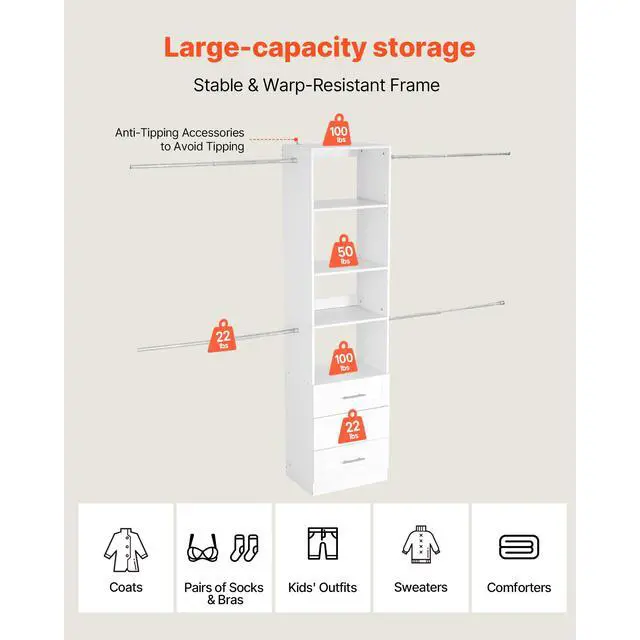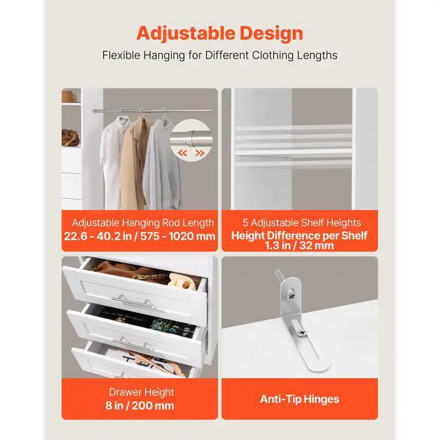 VEVOR Closet System with 3 Drawers, Adjustable Height Wooden Closet Organizers, Modern Walk-in Wardrobe Organization with 4 Retractable Clothes Hanger Rods, Freestanding Garment Rack Storage, White