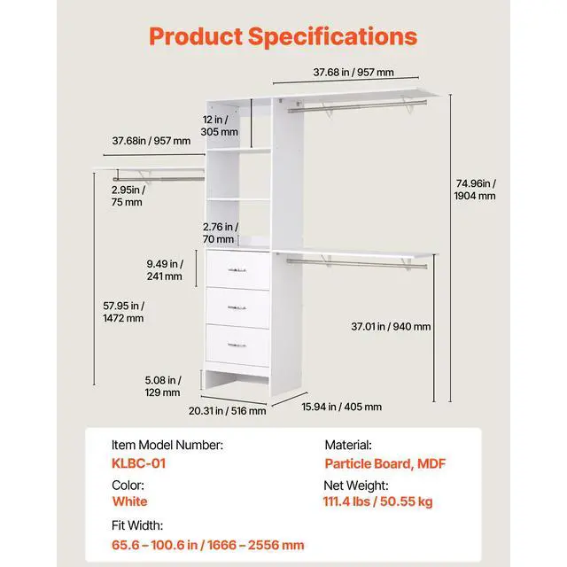 Color: White,Item Model Number: KLBC-01,Material: Particle Board, MDF,Product Dimensions: 95.7 x 16 x 75 in / 2430 x 405 x 1904 mm,Net Weight: 111.4 lbs / 50.6 kg,Fit Width: 65.6 100.6 in / 1666 2556 mm