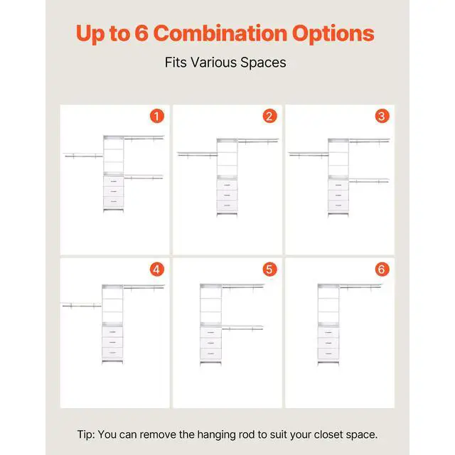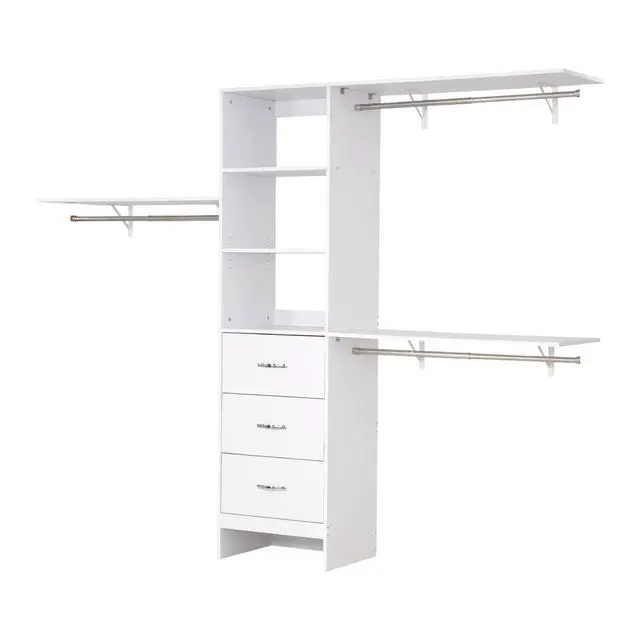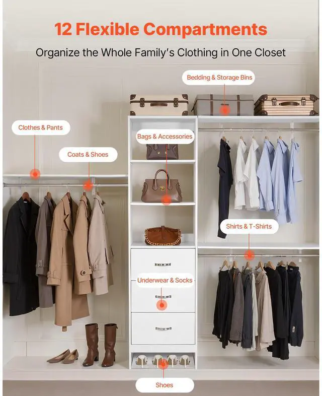 VEVOR Closet System with 3 Drawers, Adjustable Height Wooden Closet Organizers, Modern Walk-in Wardrobe Organization with 3 Retractable Clothes Hanger Rods, Freestanding Garment Rack Storage, White