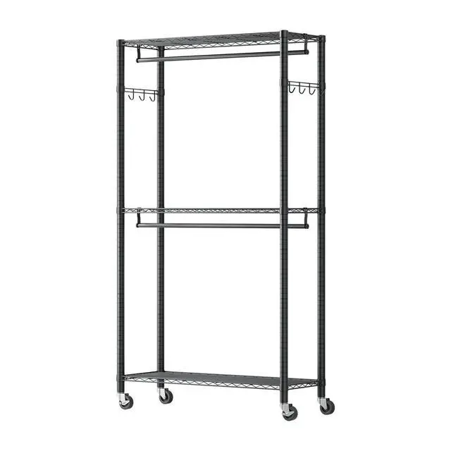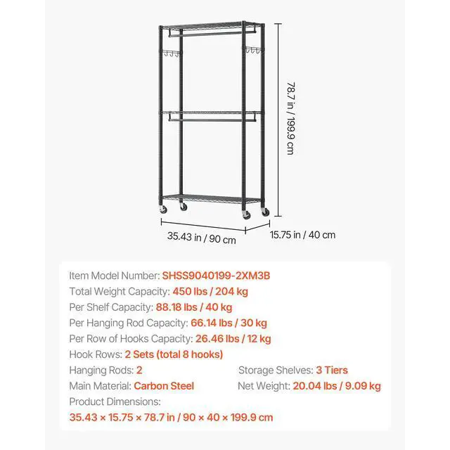 Per Shelf Capacity: 88.18 lbs / 40 kg,Per Row of Hooks Capacity: 26.46 lbs / 12 kg,Hook Rows: 2 Sets (total 8 hooks),Total Weight Capacity: 450 lbs / 204 kg,Storage Shelves: 3 Tiers,Hanging Rods: 2,Item Model Number: SHSS9040199-2XM3B,Product Dimensions: 35.43 x 15.75 x 78.7 in / 90 x 40 x 199.9 cm,Per Hanging Rod Capacity: 66.14 lbs / 30 kg,Net Weight: 20.04 lbs / 9.09 kg,Main Material: Carbon Steel