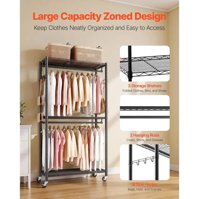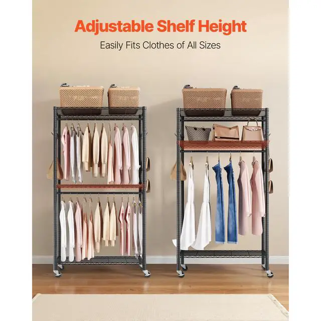 VEVOR Rolling Clothes Rack, Heavy Duty Clothing Garment Rack, 3 Adjustable Tiers Clothing Racks with Carbon Steel, 450 lbs Load Capacity Closet Wardrobe for Bedroom, Clothing Store, Hallway