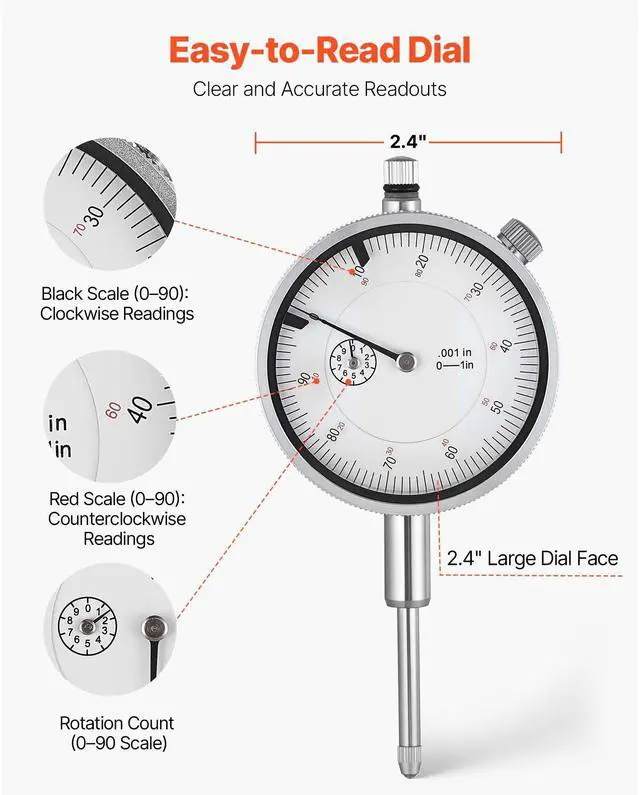 Dial Diameter: 2.4 inch / 60 mm,Measuring Range: 01 inch / 25.4 mm,Measuring Accuracy: 0.001 inch / 0.03 mm,Foam Insert Size: 11.81 x 8.27 x 4.53 inch / 300 x 210 x 115 mm,Item Model Number: IG520-183,Net Weight: 1.76 lbs / 0.8 kg,Base Type: 360° Flexible Arm with Locking Clamp