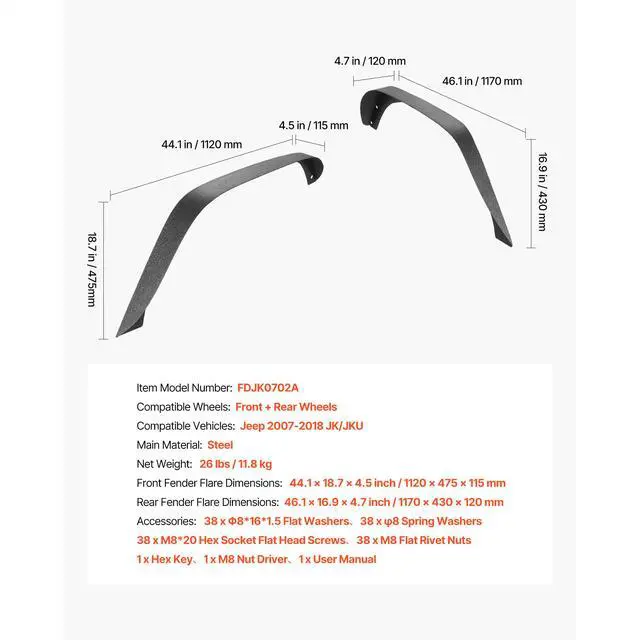 Rear Fender Flare Dimensions: 46.1 x 16.9 x 4.7 inch / 1170 x 430 x 120 mm,Compatible Wheels: Front + Rear Wheels,Item Model Number: FDJK0702A,Compatible Vehicles: Jeep 2007-2018 JK/JKU,Front Fender Flare Dimensions: 44.1 x 18.7 x 4.5 inch / 1120 x 475 x 115 mm,Net Weight: 26 lbs / 11.8 kg,Main Material: Steel