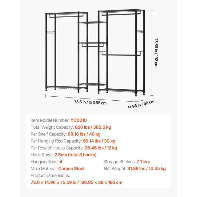 Per Shelf Capacity: 88.18 lbs / 40 kg,Per Row of Hooks Capacity: 26.46 lbs / 12 kg,Hook Rows: 2 Sets (total 8 hooks),Total Weight Capacity: 850 lbs / 385.5 kg,Storage Shelves: 7 Tiers,Hanging Rods: 4,Item Model Number: YC0010,Product Dimensions: 73.6 x 14.96 x 75.59 in / 186.95 x 38 x 192 cm,Per Hanging Rod Capacity: 66.14 lbs / 30 kg,Net Weight: 31.86 lbs / 14.45 kg,Main Material: Carbon Steel