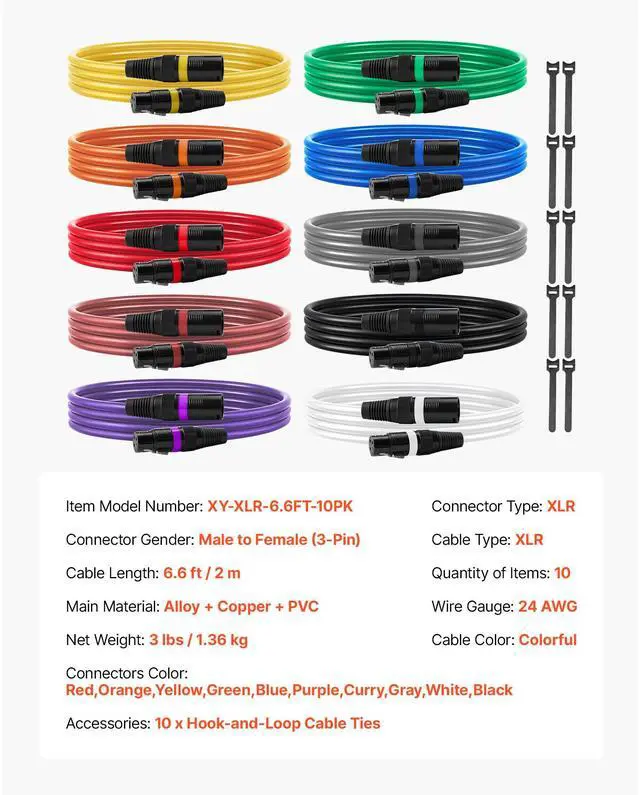 Cable Type: XLR,Cable Color: Colorful,Item Model Number: XY-XLR-6.6FT-10PK,Connector Type: XLR,Connector Gender: Male to Female (3-Pin),Cable Length: 6.5 ft/2 m,Product Dimensions: 6.30 x 5.12 x 5.12 in/160 x 130 x 130 mm,Number of Items: 10,Wire Gauge: 24 AWG,Net Weight: 3 lbs/1.36 kg,Main Material: Alloy + Copper + PVC,Connectors Color: Red,Orange,Yellow,Green,Blue,Purple,Curry,Gray,White,Black