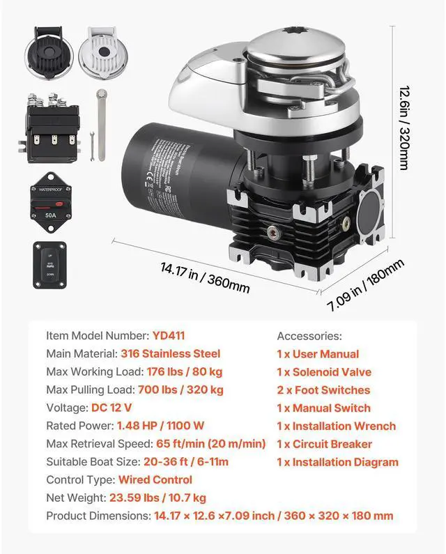 Suitable Boat Size: 20-36 ft / 6-11m ,Max Pulling Load: 700 lbs / 320 kg,Max Retrieval Speed: 65 ft/min (20 m/min),Max Working Load: 176 lbs / 80 kg ,Control Type: Wired Control,Voltage: DC 12 V,Item Model Number: YD411,Rated Power: 1.48 HP / 1100 W,Product Dimensions: 14.76 x 13.58 x7.87 in / 375 x 345 x 200 mm,Net Weight: 23.59 Ibs / 10.7 kg,Main Material: 316 Stainless Steel