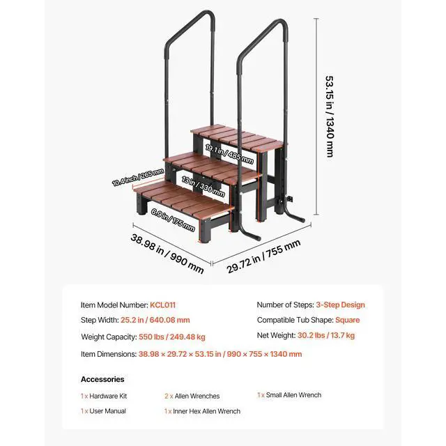 Weight Capacity: 550 lbs / 249.48 kg,Number of Steps: 3-Step,Compatible Tub Shape: Square,Color: Brown and Black,Item Model Number: KCL011,Step Width: 25.2 in / 640.08 mm,Item Dimensions: 38.98 x 29.72 x 53.15 in / 990 x 755 x 1340 mm,Net Weight: 30.2 lbs / 13.7 kg