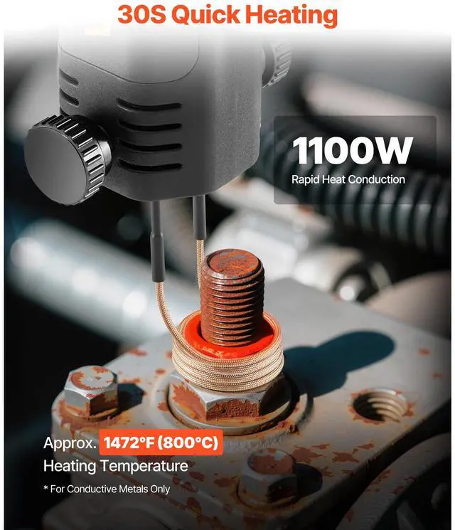 Copper Wire Diameter: 0.1 in / 2.5 mm,Power Cord Length: 6 ft / 1.9 m,Main Materials: Nylon, Fiberglass, Pure Copper, Aluminum,Output Power: 1100W,Product Dimension: 15.2 x 2.8 x 2.9 in / 385 x 72 x 74 mm,Item Model Number: H7C,Product Weight: 3 lbs / 1.3 kg,Max Continuous Operating Time: 6 min,Heating Temperature: Approx. 1472 / 800,Heating Nut Diameter: 0.2-1 in / 5-26 mm,Number of Coils: 3