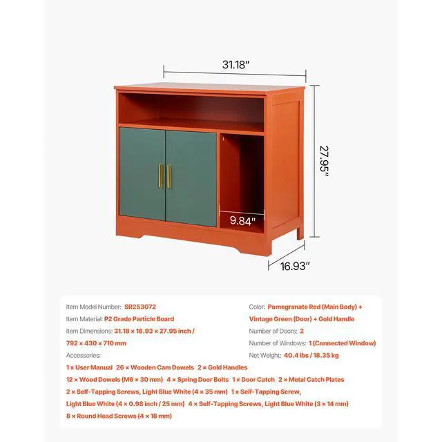 Item Material:P2 Grade Particle Board (0.59 inch / 15 mm), MDF (0.59 inch / 15 mm and 3 mm),Weight Capacity: Top: 132.28 lb / 60 kg, Bottom: 99.20 lb / 45 kg,Support Legs: 4 pcs, Height: 3.35 inch / 85 mm, Thickness: 0.59 inch / 15 mm,Item Model Number: SR253072,Color Style: Pomegranate Red (Main Body) + Vintage Green (Door) + Gold Handle,Number of Doors: 2 (1 Outer Door + 1 Inner Partition Door),Item Dimensions: 31.18 × 16.93 × 27.95 inch / 792 × 430 × 710 mm,Number of Windows: 1,Net Weight: 40.4 lbs / 18.35 kg,Entry Height: 9.80 inch / 248.92 mm,Right-Side Window: 16.54 × 8.66 inch / 420 × 220 mm, Height from Floor: 3.94 inch / 100 mm