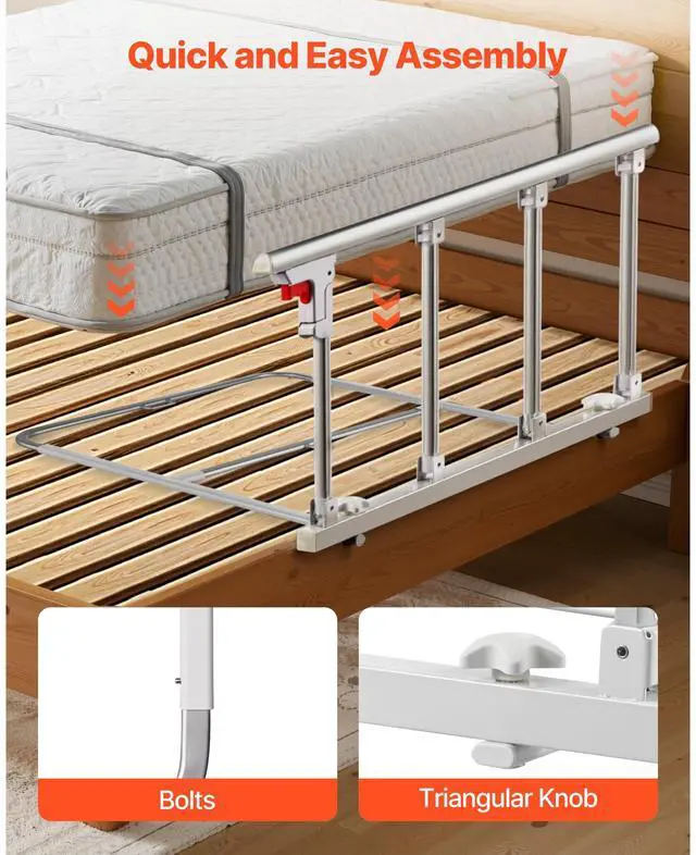 VEVOR Foldable Bed Rail for Elderly, 38 in Bedside Assist Rail with Fixing Strap, Adjustable Height Pipe Bedside Cane, High-Strength Metal Senior Bed Bar, Hand Guard Grab Fits King, Queen, Full, Twin