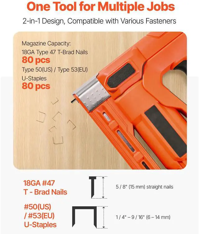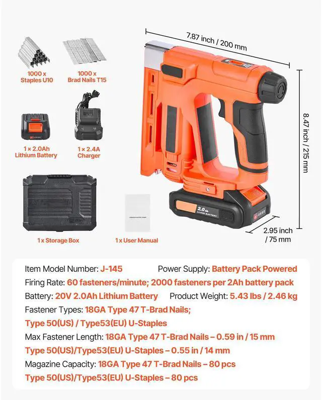 Fastener Types: 18GA Type 47 T-Brad Nails; Type 50 U-Staples,Type 50 U-Staples Max Length: 0.55 in / 14 mm,Battery: 20V 2.0Ah Lithium Battery,Item Model Number: J-145,Product Weight: 5.43 lbs / 2.46 kg,Firing Rate: 60 Fasteners/Minute,18GA Type 47 T-Brad Nails Max Length: 0.59 in / 15 mm,Product Dimensions: 7.87 x 8.47 x 2.95 in / 200 x 215 x 75 mm,Power Supply: Battery Pack Powered