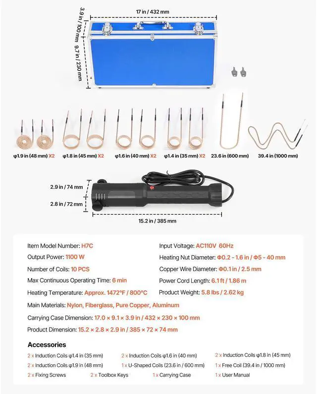 Copper Wire Diameter: 0.1 in / 2.5 mm,Power Cord Length: 6 ft / 1.9 m,Main Materials: Nylon, Fiberglass, Pure Copper, Aluminum,Output Power: 1100W,Product Dimension: 15.2 x 2.8 x 2.9 in / 385 x 72 x 74 mm,Item Model Number: H7C,Product Weight: 5.8 lbs / 2.62 kg,Max Continuous Operating Time: 6 min,Heating Temperature: Approx. 1472 / 800,Carrying Case Dimension: 17.0 x 9.1 x 3.9 in / 432 x 230 x 100 mm,Heating Nut Diameter: 0.2-1.6 in / 5-40 mm,Number of Coils: 10