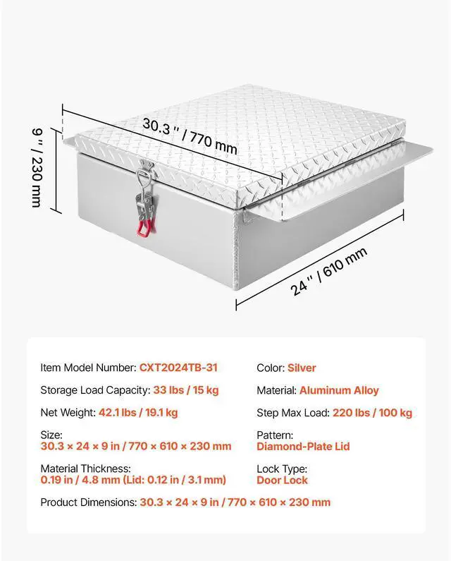 Step Max Load: 220 lbs / 100 kg,Pattern: Diamond-Plate Lid,Lock Type: Door Lock,Storage Load Capacity: 33 lbs / 15 kg,Size: 9 x 24 x 30.3 in / 230 x 610 x 770 mm,Color: Silver,Item Model Number: CXT2024TB-31,Material: Aluminum Alloy,Product Dimensions: 30.31 x 24.02 x 9.06 in / 770 x 610 x 230 mm,Material Thickness: 0.19 in / 4.8 mm (Lid: 0.12 in / 3.1 mm),Net Weight: 42.1 lbs / 19.1 kg