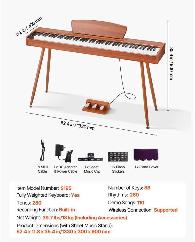 Number of Keys: 88,Tones: 280,Recording Function: Built-in,Wireless Connection: Supported,Demo Songs: 110,Item Model Number: S195,Rhythms: 260,Fully Weighted Keyboard: Yes
