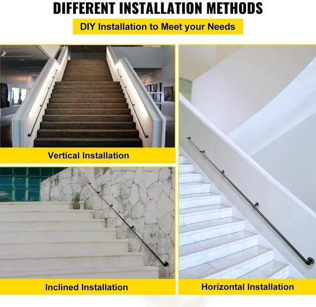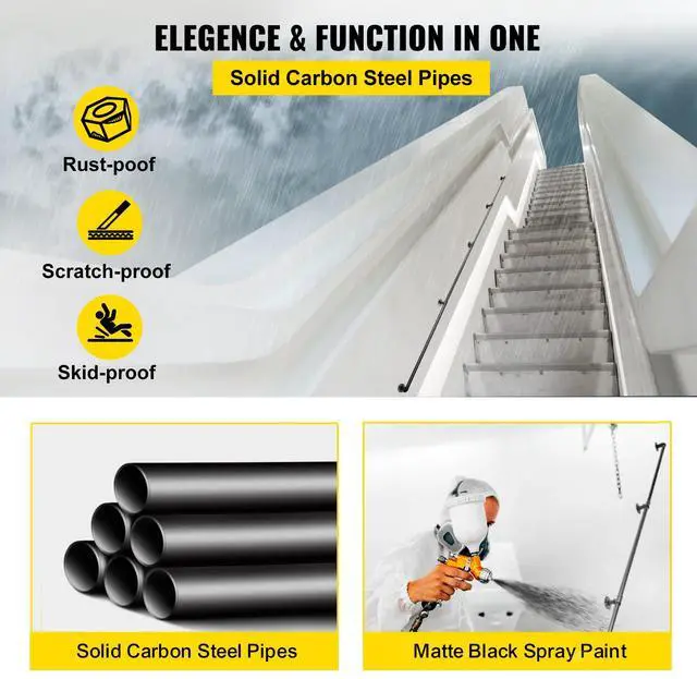 VEVOR Pipe Stair Handrail, 13FT Staircase Handrail, 440LBS Load Capacity Carbon Steel Pipe Handrail, Industrial Pipe Handrail with Wall Mount Support, Round Corner Wall Handrailing for Indoor, Outdoor