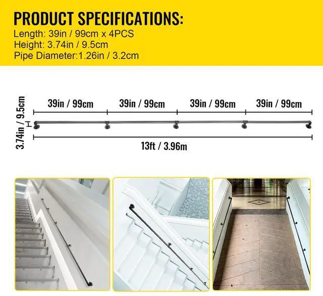 Total Length: 13 FT/ 3.96 m,Item Weight(Each): 2.2lbs/ 1 kg,Pipe Thickness: 0.06"/ 1.5 mm,Pipe Diameter: 1.26"/ 32 mm,Color: Black,Model: VV-GYGFS-HS13YC,Wall Mount Support: 5 PCS,Material: Carbon Steel+ Matte Finish,Load Capacity (Each): 440lbs/ 200 kg,Stand out Width: 3.74"/ 95 mm,Pre-hole Diameter: 0.23"/ 6 mm,Pipe Amount: 4 PCS
