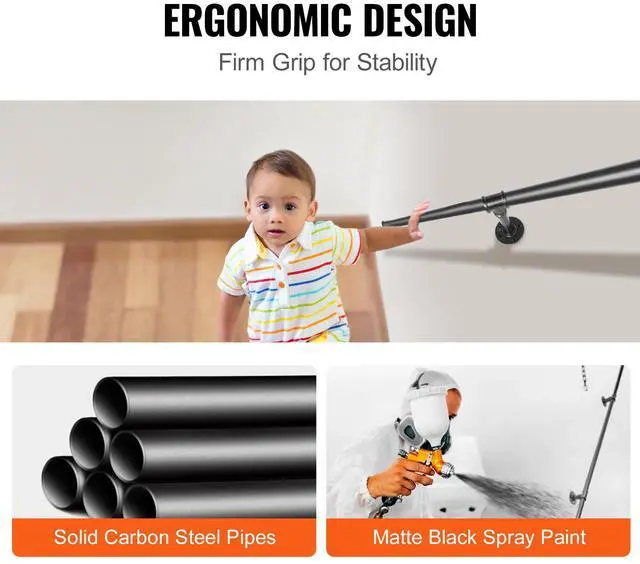 VEVOR Pipe Stair Handrail, 8FT Staircase Handrail, 440LBS Load Capacity Carbon Steel Pipe Handrail, Industrial Pipe Handrail with Wall Mount Support, Round Corner Wall Handrailings for Indoor, Outdoor