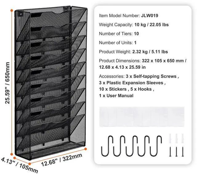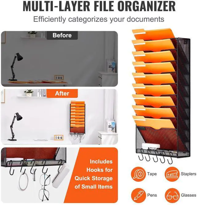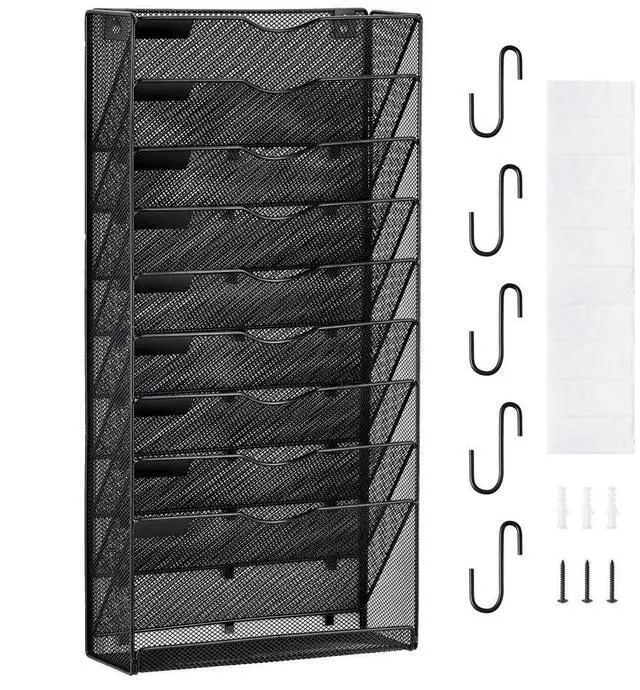 VEVOR File Wall Rack, One-Piece 10 Pockets Mesh Wall File Holder, Wall Mounted Magazine Mail Paper & Document Storage Folder, Metal Wall File Organizer with Nametag Label, for Office Home & School