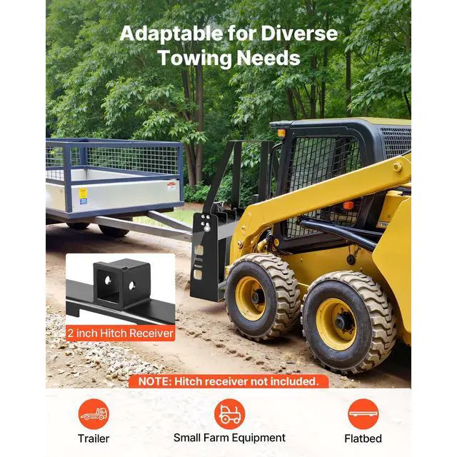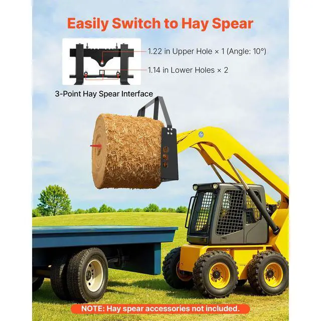 Rated Capacity: 4000 lbs / 1814 kg,Fork Frame: 110.2 lbs / 50 kg,Fork Tines: 185.2 lbs / 84 kg,Mounting Plate Dimensions: 45 x 7 x 34.25 in / 1150 x 180 x 870 mm,Hay Fork Connections: 3,Thickness: 1.38 in / 35 mm,Long Side: 48 in / 1220 mm,Hitch Receiver Size: 2 in / 50.8 mm,Fork Dimensions:,Item Model Number: WBS-029,Product Weight:,Short Side: 21.6 in / 549 mm,Adjustable Fork Distance Range: 244.8 in / 501138 mm,Width: 4 in / 99.5 mm,Compatible Vehicle: Universal Skid Steer,Main Material: Q235A + Surface Coating