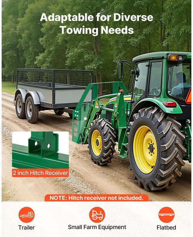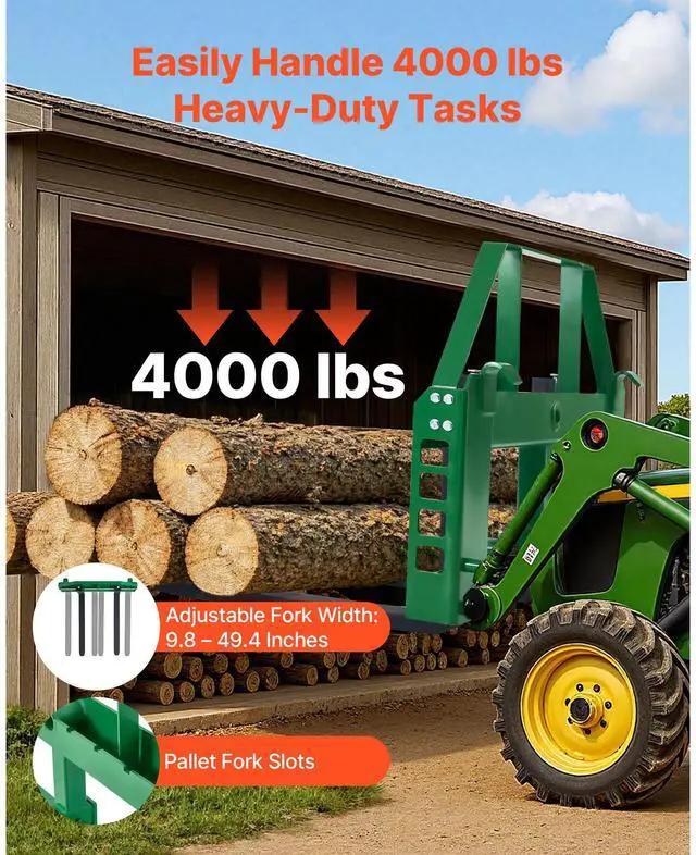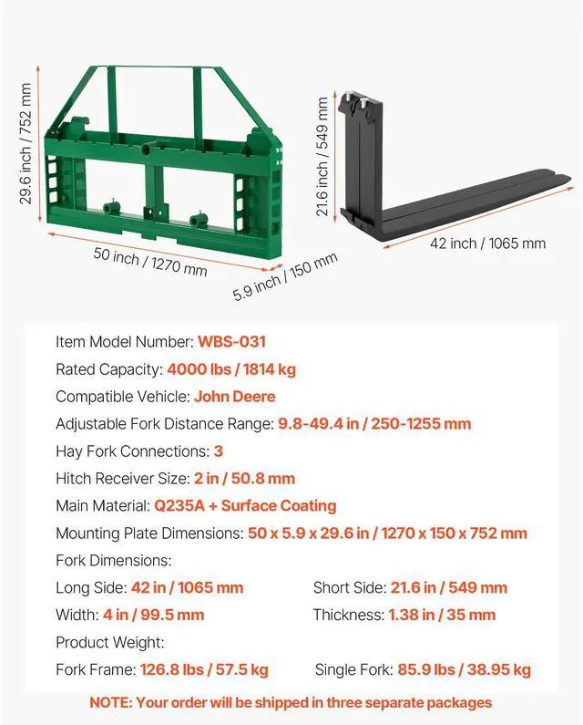 Rated Capacity: 4000 lbs / 1814 kg,Fork Frame: 126.8 lbs / 57.5 kg,Fork Tines: 171.7 lbs / 77.9 kg,Mounting Plate Dimensions: 50 x 5.9 x 29.6 in / 1270 x 150 x 752 mm,Hay Fork Connections: 3,Thickness: 1.38 in / 35 mm,Long Side: 42 in / 1065 mm,Hitch Receiver Size: 2 in / 50.8 mm,Fork Dimensions:,Item Model Number: WBS-031,Product Weight:,Short Side: 21.5 in / 545 mm,Adjustable Fork Distance Range: 9.8-49.4 in / 250-1255 mm,Width: 4 in / 99.5 mm,Compatible Vehicle: Specific Tractor,Main Material: Q235A + Surface Coating