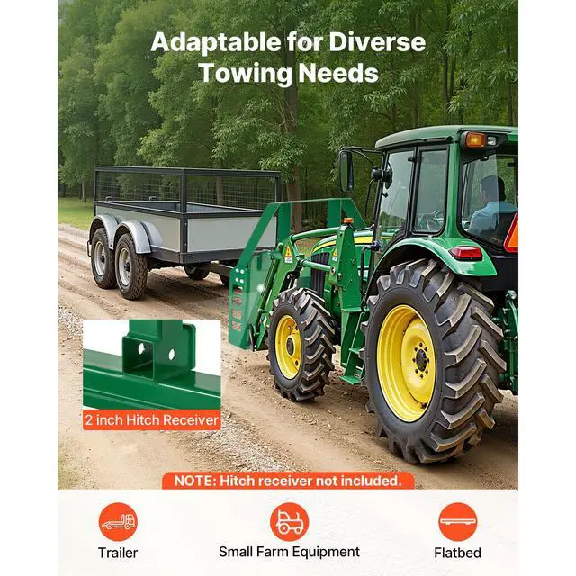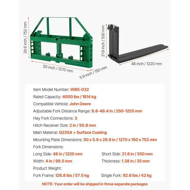Rated Capacity: 4000 lbs / 1814 kg,Fork Frame: 126.8 lbs / 57.5 kg,Fork Tines: 185.2 lbs / 84 kg,Mounting Plate Dimensions: 50 x 5.9 x 29.6 in / 1270 x 150 x 752 mm,Hay Fork Connections: 3,Thickness: 1.38 in / 35 mm,Long Side: 48 in / 1220 mm,Hitch Receiver Size: 2 in / 50.8 mm,Fork Dimensions:,Item Model Number: WBS-032,Product Weight:,Short Side: 21.6 in / 550 mm,Adjustable Fork Distance Range: 9.8-49.4 in / 250-1255 mm,Width: 4 in / 99.5 mm,Compatible Vehicle: Specific Tractor,Main Material: Q235A + Surface Coating