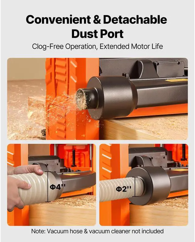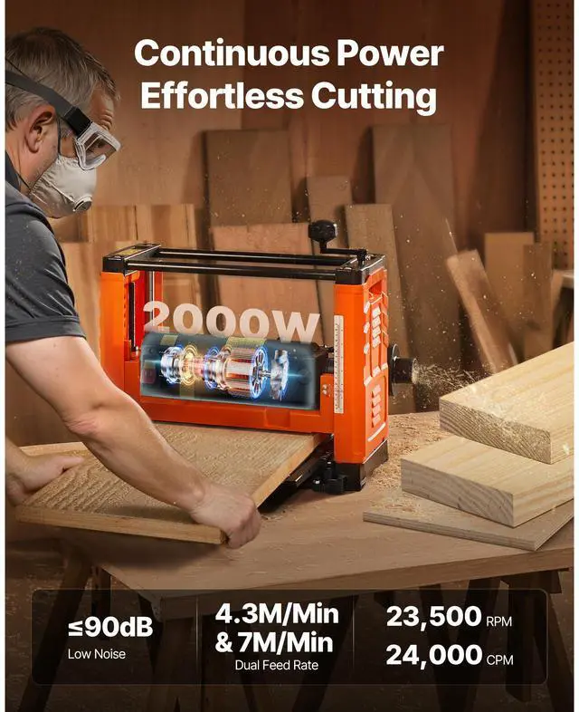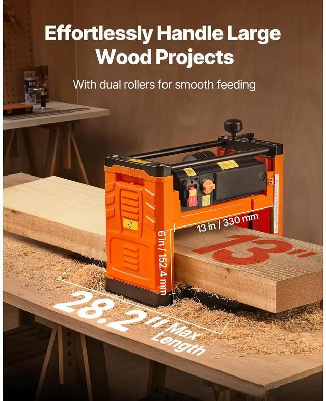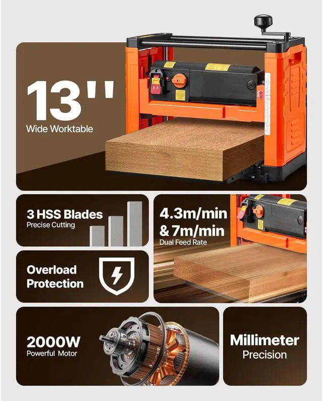 VEVOR Thickness Planer, Two Speed, 13-Inch Width Worktable Power Benchtop Planer, Three-Blade, 2000W 23500 RPM Powerful Motor, Dual Rollers, Over Protection, Woodworking for Hard & Soft Wood Material