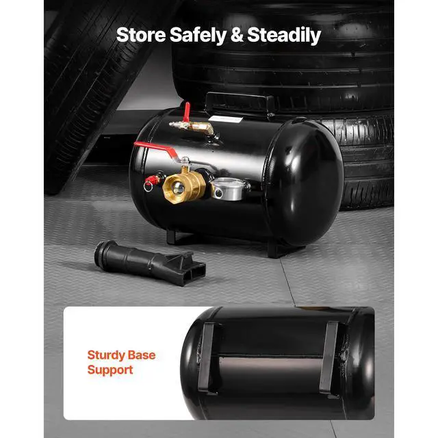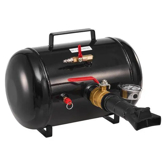 Compatible Tire Size: 22.5 in / 572 mm,Item Dimensions (LxWxH): 15.7 x 21.1 x 11.6 in / 400 x 535 x 295 mm,Release Valve Material: Brass,Color: Black,Safety Valve Specification: G1/4,Safety Valve Material: Brass,Safety Valve Relief Value: 135 - 145 PSI / 0.9 - 1.0 MPa,Capacity: 5 Gal / 18.9 L,Working Pressure: 87 - 116 PSI / 0.6 - 0.8 MPa,Item Model Number: HM2902,Style: Heavy-Duty,Compatible Vehicles: Pickup, Truck, ATV, Jeep, Van, Lawn Tractor, RV,Net Weight: 19.1 lbs / 8.65 kg,Tank Material: Carbon Steel,Maximum Pressure: 145 PSI / 1 MPa,Duckbill Nozzle Length: 8.1 in / 205 mm,Main Material: Carbon Steel, Copper, Nylon