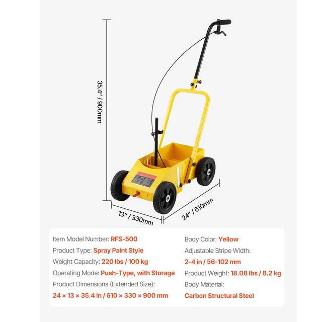 Adjustable Stripe Width: 2-4 in / 56-102 mm,Body Material: Carbon Structural Steel,Weight Capacity: 220 lbs / 100 kg,Extended Size (L x W x H): 24 x 13 x 35.4 in / 610 x 330 x 900 mm,Product Type: Spray Paint Style,Body Color: Yellow,Item Model Number: RFS-500,Product Weight: 18.08 lbs / 8.2 kg,Operating Mode: Push-Type, with Storage