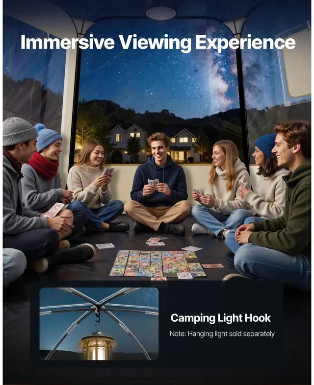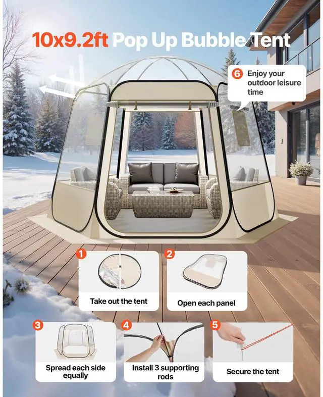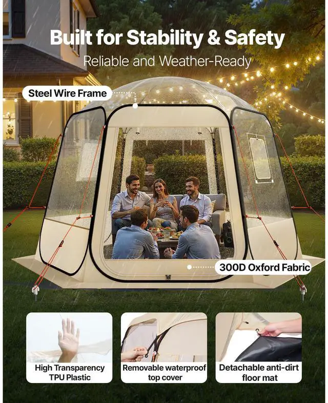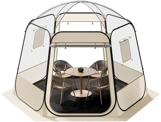 Opening Style: 6-Side Pop-Up,Item Material: Flat Steel Wire + Fiberglass Rod + 0.15 mm TPU + 210D Oxford Fabric,Main Materials: TPU Plastic + 210D Oxford Fabric + Steel Wire Support,Color: Beige + Transparent TPU with Black Trim and Black Fiberglass Rods,Item Model Number: 121085,Item Dimensions: 120.08 × 108.27 × 86.61 in / 3050 × 2750 × 2200 mm,Item Type: Scenic Tent,Net Weight: 23.15 lbs / 10.50 kg