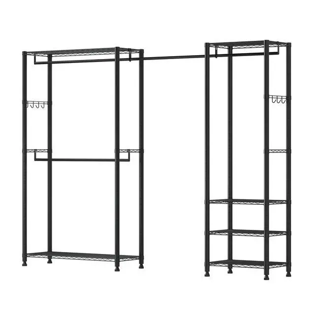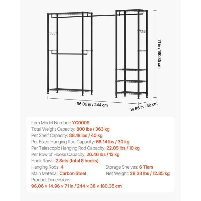 Per Shelf Capacity: 88.18 lbs / 40 kg,Per Row of Hooks Capacity: 26.46 lbs / 12 kg,Hook Rows: 2 Sets (total 8 hooks),Total Weight Capacity: 800 lbs / 363 kg,Storage Shelves: 6 Tiers,Per Fixed Hanging Rod Capacity: 66.14 lbs / 30 kg,Hanging Rods: 4,Item Model Number: YC0009,Per Telescopic Hanging Rod Capacity: 22.05 lbs / 10 kg,Product Dimensions: 96.06 x 14.96 x 71 in / 244 x 38 x 180.35 cm,Net Weight: 28.33 lbs / 12.85 kg,Main Material: Carbon Steel