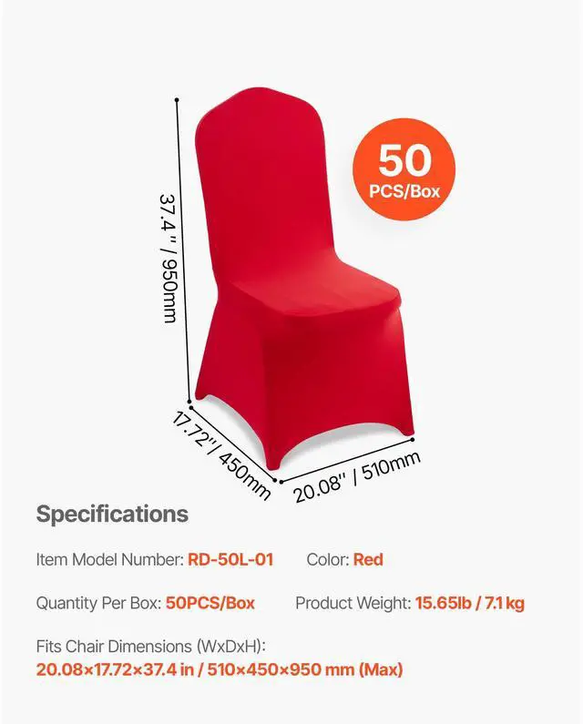 Fits Chair Dimensions (WxDxH): 20.08 x 17.72 x 37.4 in / 510 x 450 x 950 mm (Max),Color: Red,Item Model Number: RD-50L-01,Quantity Per Box: 50PCS/Box,Net Weight: 15.65lb / 7.1 kg