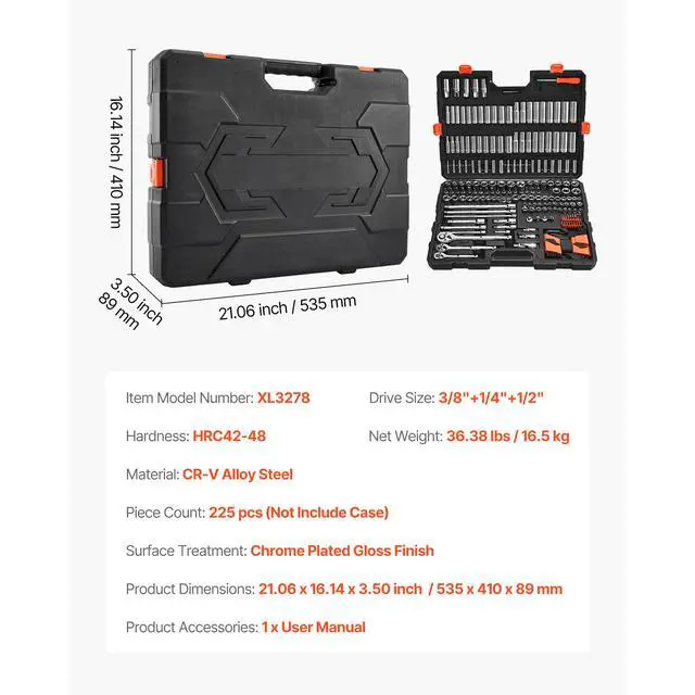 Item Model Number: XL3278,Surface Treatment: Chrome Plated Gloss Finish,Material: CR-V Alloy Steel,Hardness: HRC42-48,Product Dimensions: 21.06 x 16.14 x 3.50 in/535 x 410 x 89 mm,Piece Count: 225 pcs (Not Include Case),Net Weight: 36.38 lbs / 16.5 kg,Drive Size: 3/8 & 1/4 & 1/2 in / 9.53 & 6.35 & 12.7 mm