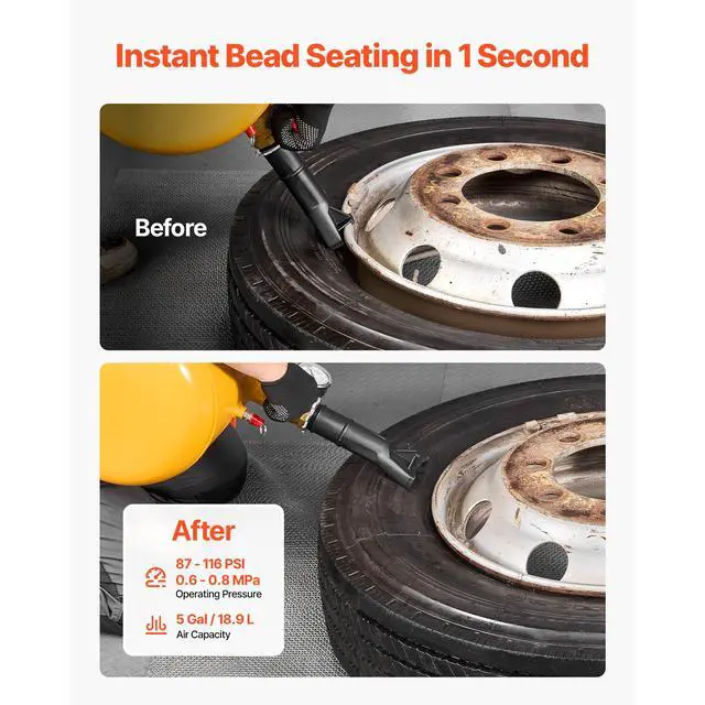 VEVOR Air Tire Bead Seater, 5 Gal / 18.9 L, Heavy Duty Tire Bead Blaster Tool, 87-116 PSI Operating Pressure, Air Trigger Seating Inflator for Pickup, Truck, ATV, Jeep, Van, Lawn Tractor, RV, Yellow