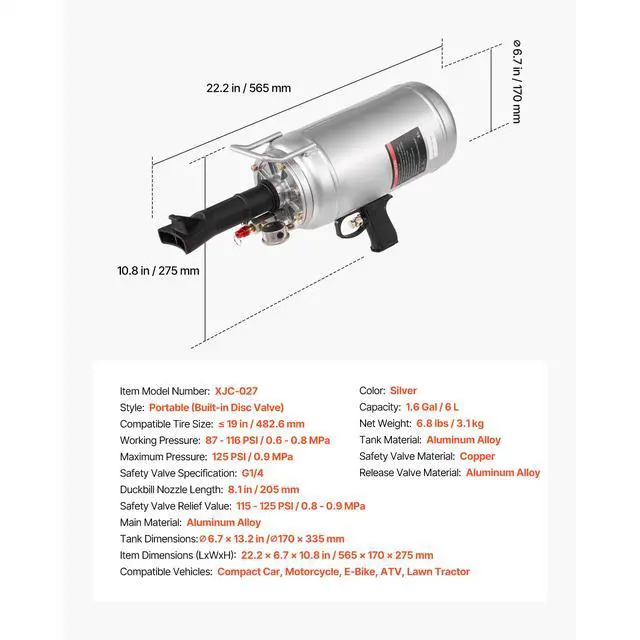 Compatible Tire Size: 19 in / 482.6 mm,Item Dimensions (LxWxH): 22.2 x 6.7 x 10.8 in / 565 x 170 x 275 mm,Release Valve Material: Aluminum Alloy,Color: Silver,Safety Valve Specification: G1/4,Tank Dimensions: 6.7 x 13.2 in / 170 x 335 mm,Safety Valve Material: Copper,Safety Valve Relief Value: 115 - 125 PSI / 0.8 - 0.9 MPa,Capacity: 1.6 Gal / 6 L,Working Pressure: 87 - 116 PSI / 0.6 - 0.8 MPa,Item Model Number: XJC-027,Style: Portable (Built-in Disc Valve),Compatible Vehicles: Compact Car, Motorcycle, E-Bike, ATV, Lawn Tractor,Net Weight: 6.8 lbs / 3.1 kg,Tank Material: Aluminum Alloy,Maximum Pressure: 125 PSI / 0.9 MPa,Duckbill Nozzle Length: 8.1 in / 205 mm,Main Material: Aluminum Alloy, Copper, Reinforced Nylon
