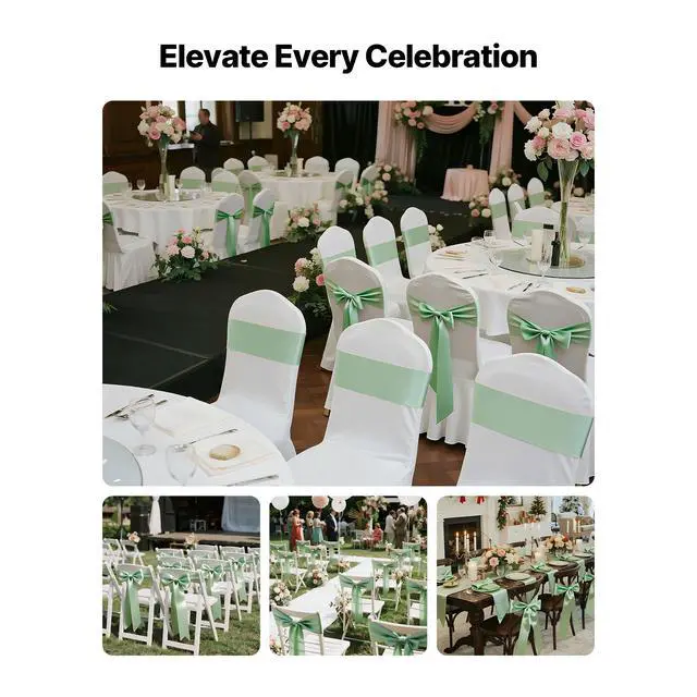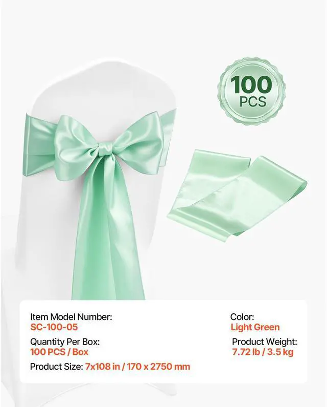 VEVOR Satin Chair Sashes Bows, 100PCS Chair Ribbon Ties Back Sash, 7 x 108 inch, Light Green Wedding Reception Decoration, for Wedding Ceremony Baby Shower Party Events Banquet Chair Cover Decoration