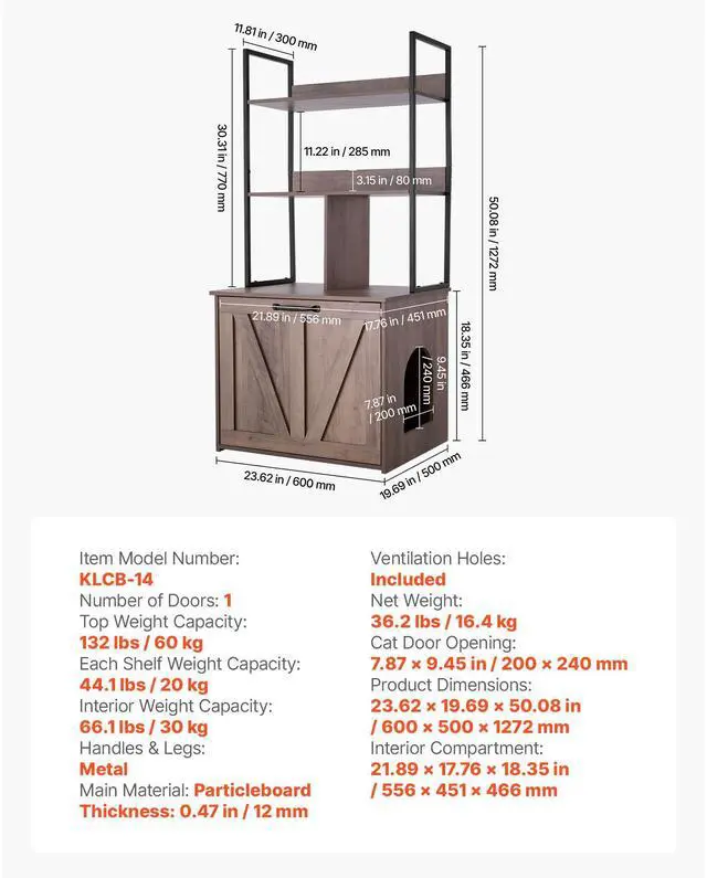 Main Materials: Particleboard (Grade), Thickness: 0.47 in / 12 mm,Item Model Number: KLCB-14,Interior Compartment: 21.89 x 17.76 x 18.35 in / 556 x 451 x 466 mm,Number of Doors: 1,Ventilation Holes: Included,Top Weight Capacity: 132 lbs / 60 kg,Interior Weight Capacity: 66.1 lbs / 30 kg,Product Dimensions: 23.62 x 19.69 x 50.08 in / 600 x 500 x 1272 mm,Net Weight: 36.2 lbs / 16.4 kg,Each Shelf Weight Capacity: 44.1 lbs / 20 kg,Handles & Legs: Metal,Cat Door Opening: 7.87 x 9.45 in / 200 x 240 mm