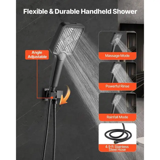 VEVOR Shower Faucet Set, 12 Inch Ceiling Mount Rainfall Shower System with 6 Inch Wall Mount Head and 4 in 1 Handheld Spray, Rotatable 3-Function Dual Rain Head Brass Valve and Trim Kit, Matte Black