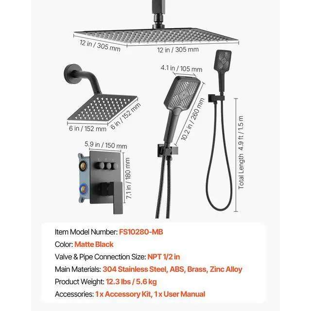 Main Materials: 304 Stainless Steel, ABS, Brass, Zinc Alloy,Valve & Pipe Connection Size: NPT 1/2 in,Color: Matte Black,Item Model Number: FS10280-MB,Product Weight: 12.3 lbs/5.6 kg