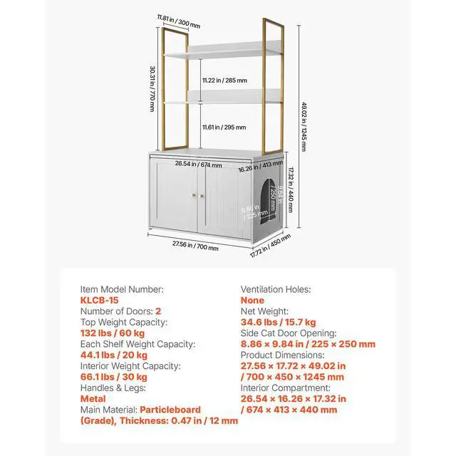 Main Materials: Particleboard (Grade), Thickness: 0.47 in / 12 mm,Side Cat Door Opening: 8.86 x 9.84 in / 225 x 250 mm,Item Model Number: KLCB-15,Interior Compartment: 26.54 x 16.26 x 17.32 in / 674 x 413 x 440 mm,Number of Doors: 2,Ventilation Holes: None,Top Weight Capacity: 132 lbs / 60 kg,Interior Weight Capacity: 66.1 lbs / 30 kg,Product Dimensions: 27.56 x 17.72 x 49.02 in / 700 x 450 x 1245 mm,Net Weight: 34.6 lbs / 15.7 kg,Each Shelf Weight Capacity: 44.1 lbs / 20 kg,Handles & Legs: Metal