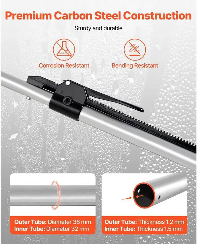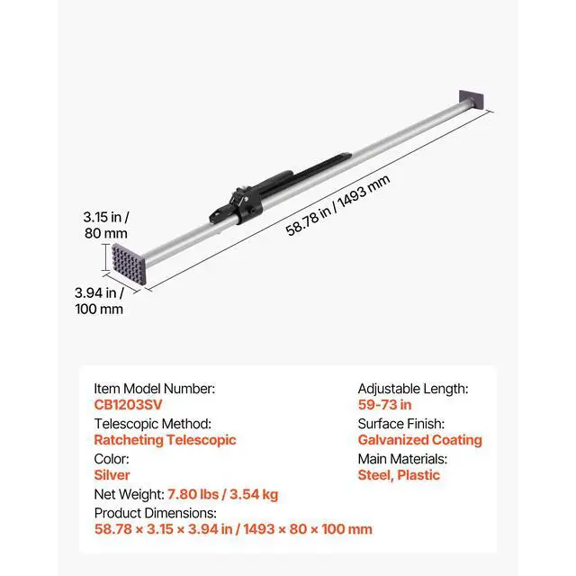 Telescopic Method: Ratcheting Telescopic,Main Materials: Steel, Plastic,Color: Silver,Item Model Number: CB1203SV,Surface Finish: Galvanized Coating,Product Dimensions: 58.78 x 3.15 x 3.94 in/1493 x 80 x 100 mm,Net Weight: 7.80 lbs/3.54 kg,Adjustable Length: 59-73 in
