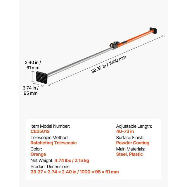Telescopic Method: Ratcheting Telescopic,Main Materials: Steel, Plastic,Color: Orange,Item Model Number: CB2501S,Surface Finish: Powder Coating,Product Dimensions: 39.37 x 3.74 x 2.40 in/1000 x 95 x 61 mm,Net Weight: 4.74 lbs/2.15 kg,Adjustable Length: 40-73 in