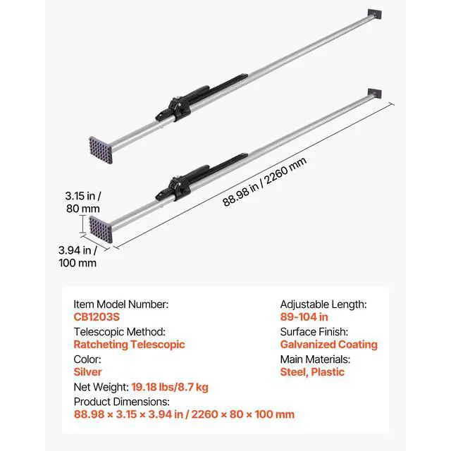 Telescopic Method: Ratcheting Telescopic,Main Materials: Steel, Plastic,Color: Silver,Item Model Number: CB1203S,Surface Finish: Galvanized Coating,Product Dimensions: 88.98 x 3.15 x 3.94 in/2260 x 80 x 100 mm,Net Weight: 19.18 lbs/8.7 kg,Adjustable Length: 89-104 in