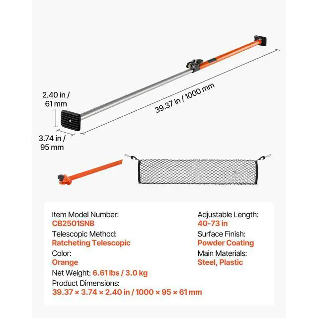 Telescopic Method: Ratcheting Telescopic,Main Materials: Steel, Plastic,Color: Orange,Item Model Number: CB2501SNB,Surface Finish: Powder Coating,Product Dimensions: 39.37 x 3.74 x 2.40 in/1000 x 95 x 61 mm,Net Weight: 6.61 lbs/3.0 kg,Adjustable Length: 40-73 in