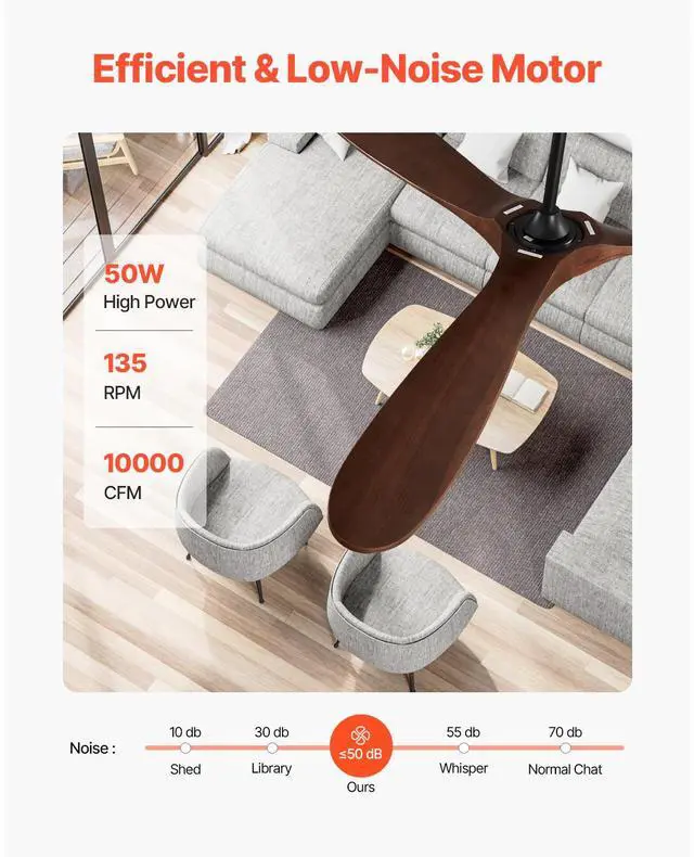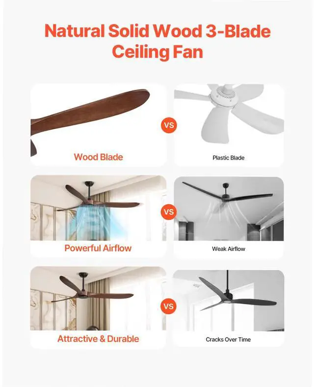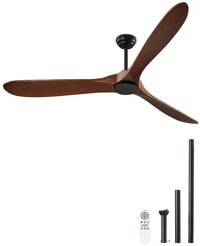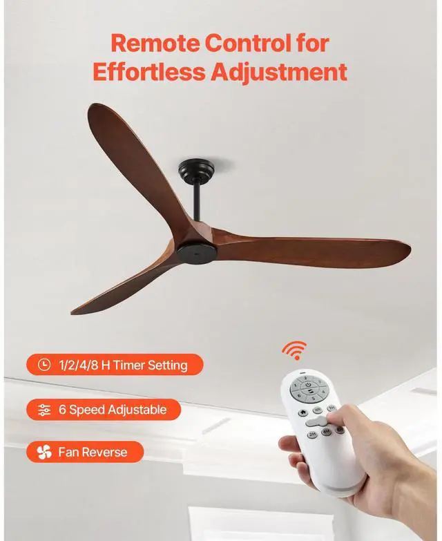VEVOR 72 Inch Ceiling Fan without Light, 6-Speed Remote Control, 3-Wood-Blade, Reversible DC Motor, Modern Low Profile Flush Mount Exterior Fan for Bedroom, Living Room, Patio, Indoor/Outdoor, Walnut